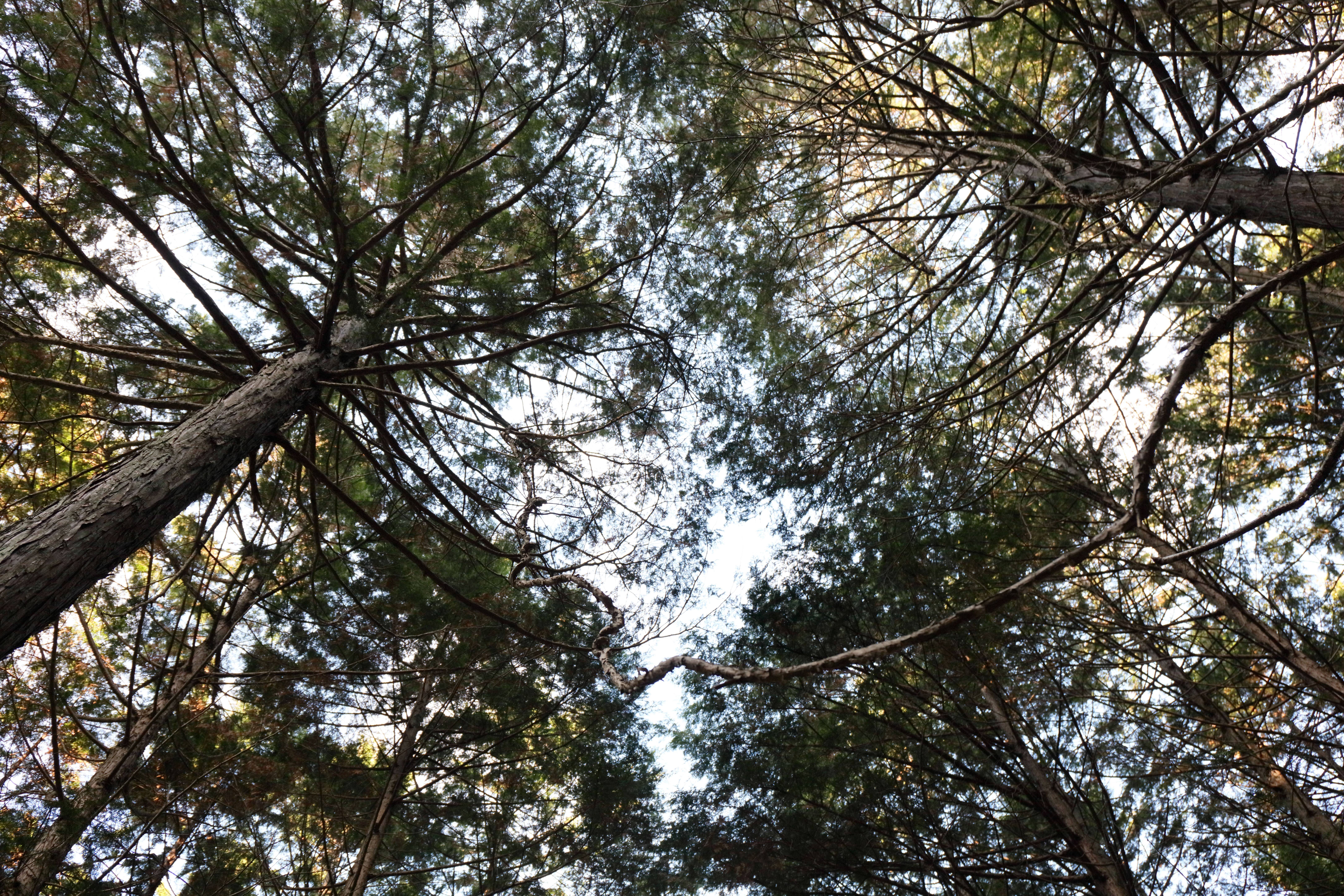 右側の樹から左の樹へ向かって細長い枝がぶらさがるように絡みついています。