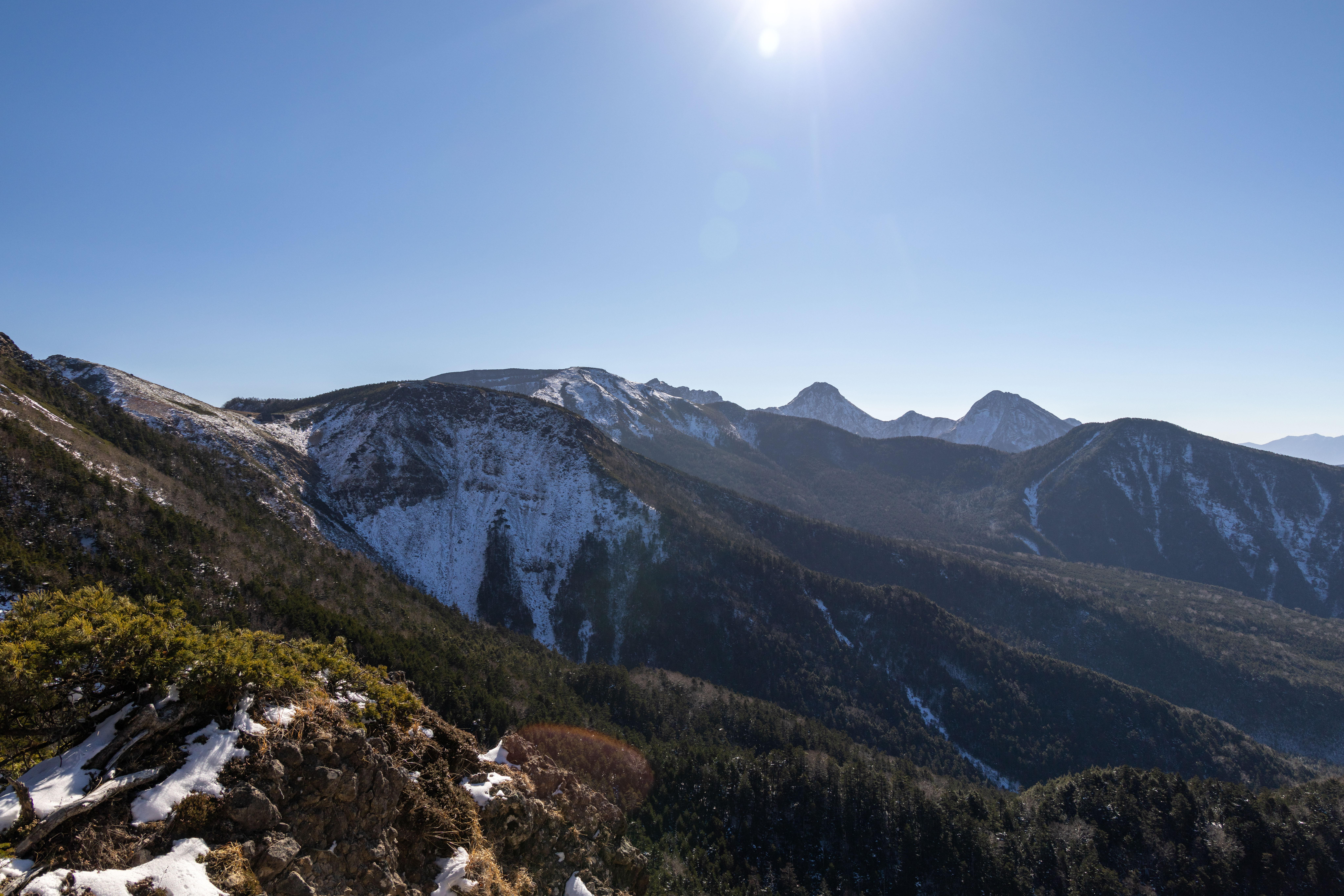 奥の右側の真っ白な山が木曽駒ケ岳、その左側に中岳、宝剣岳、伊那前岳、三沢岳と続き、檜尾岳、熊沢だけ、東川岳、空木岳、南駒ケ岳。